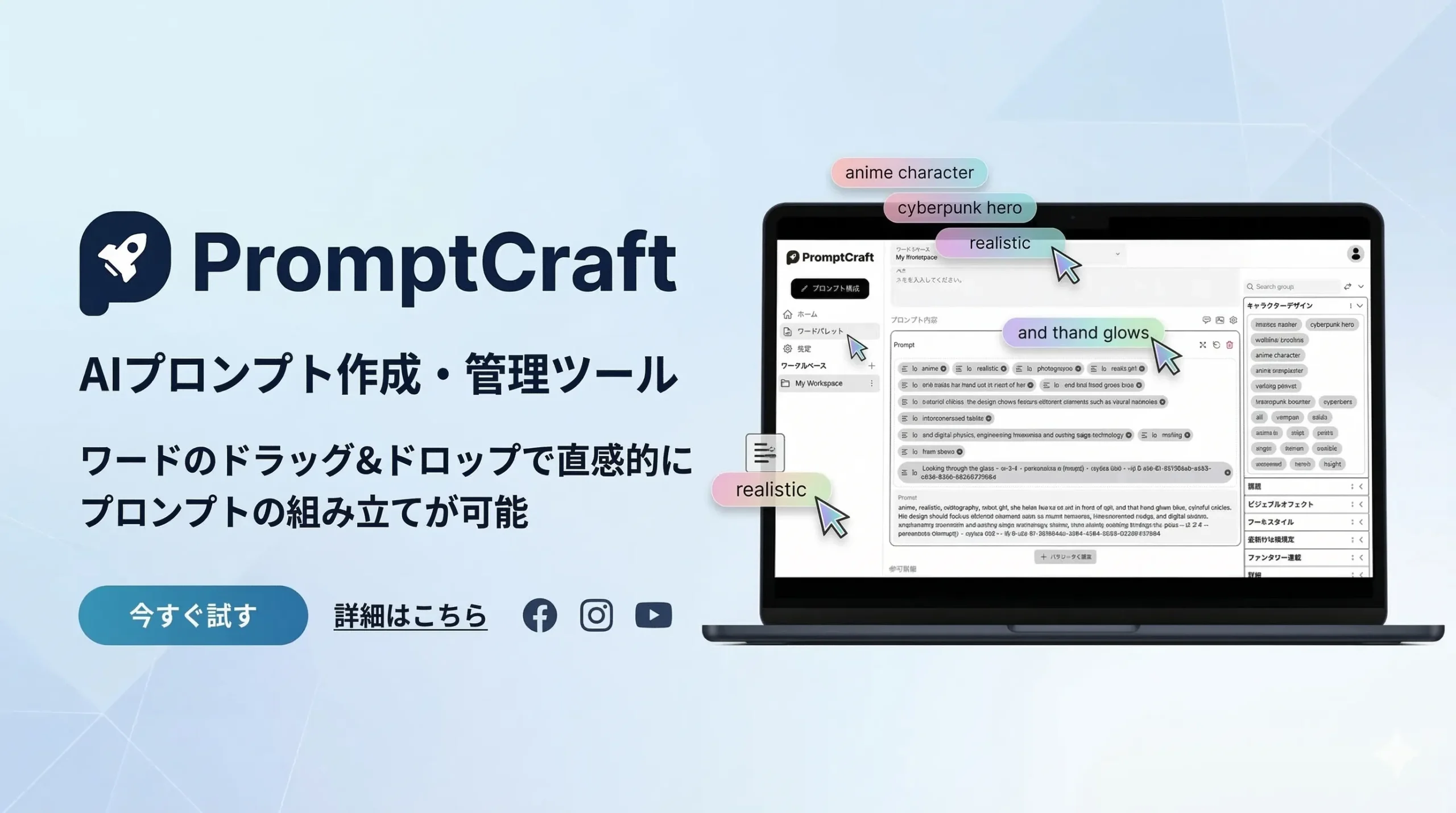 プロンプトの作成と管理を効率化するツール。複数のワークスペースやワードの登録・管理が可能で、AIツール対応の補助機能も搭載。直感的な操作でプロンプトの編集や並び替えが簡単に行え、クリエイターの生産性向上をサポートします